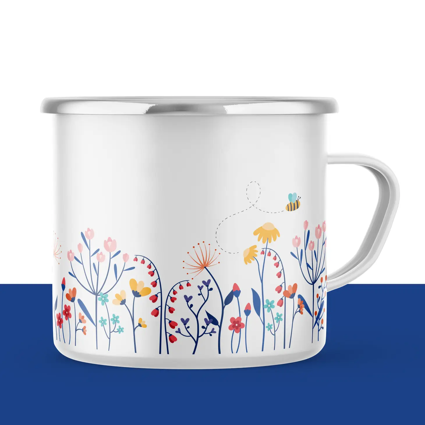 Dit is een super leuke en vrolijke emaille mok met de illustratie van een bloemen veld met bijtjes. Deze mok is handmatig bedrukt in studio jubels eigen studio.
